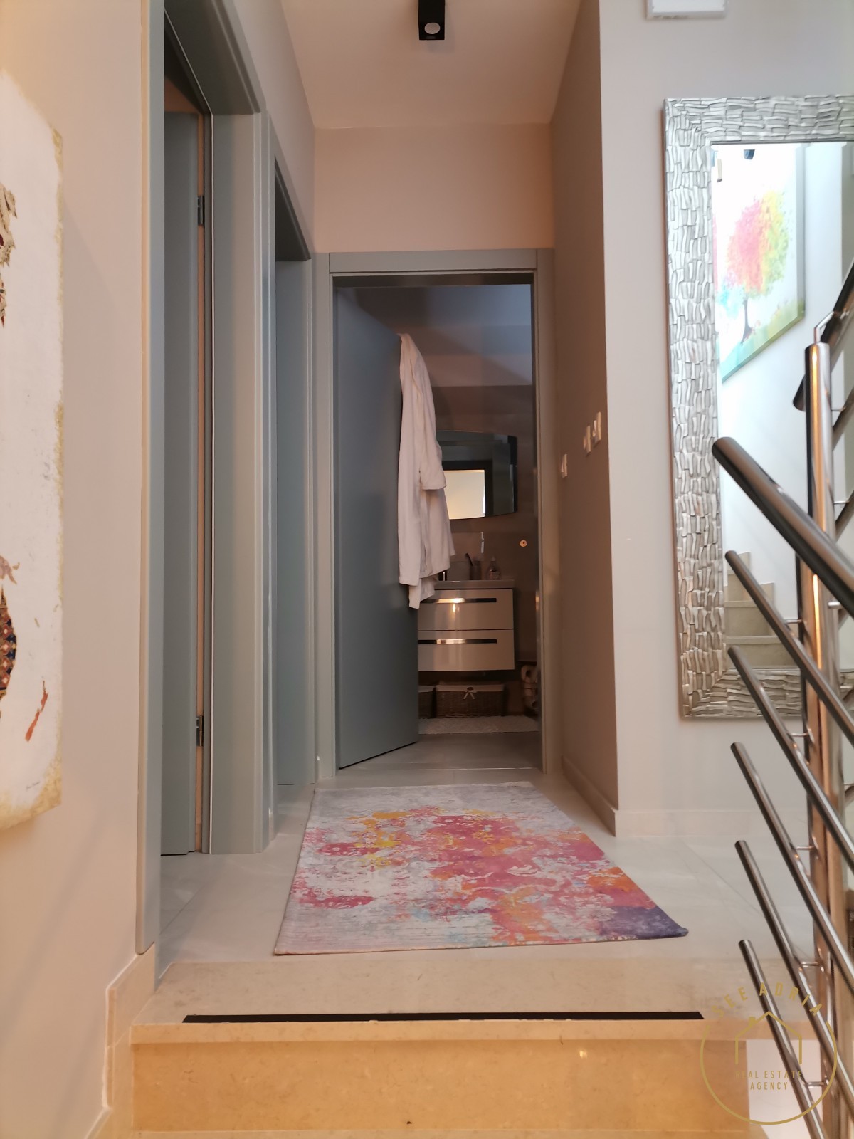 Im Obergeschoss befinden sich 2 Schlafzimmer und ein Badezimmer. Auf dem Flachdach gibt es einen Whirlpool und eine Sitzecke