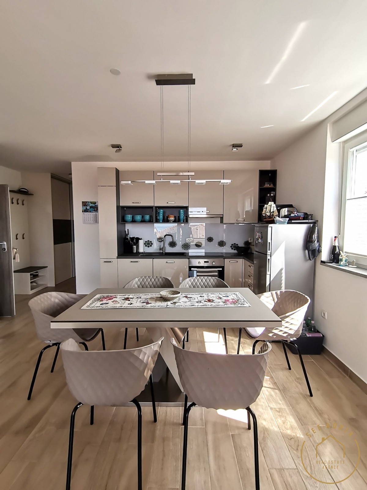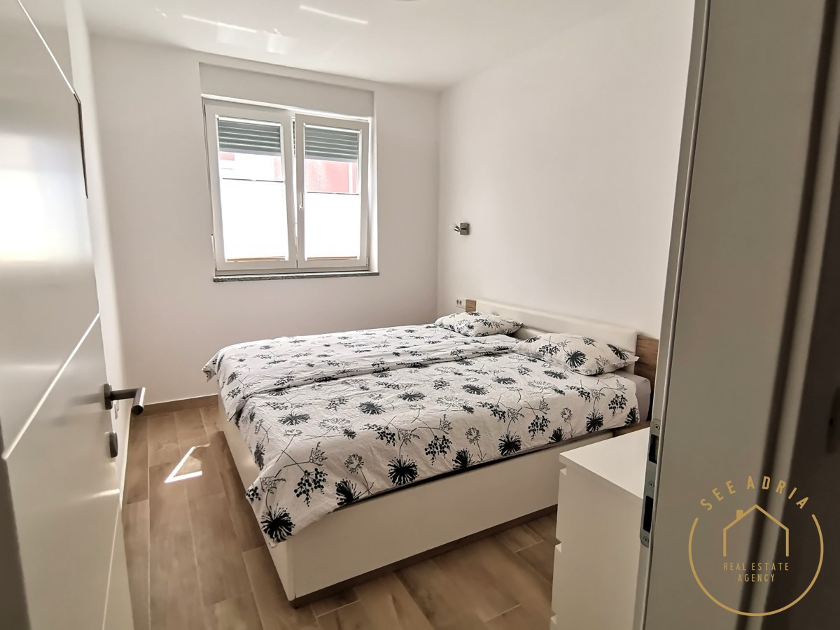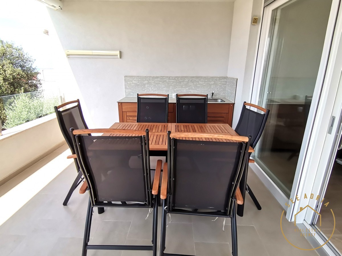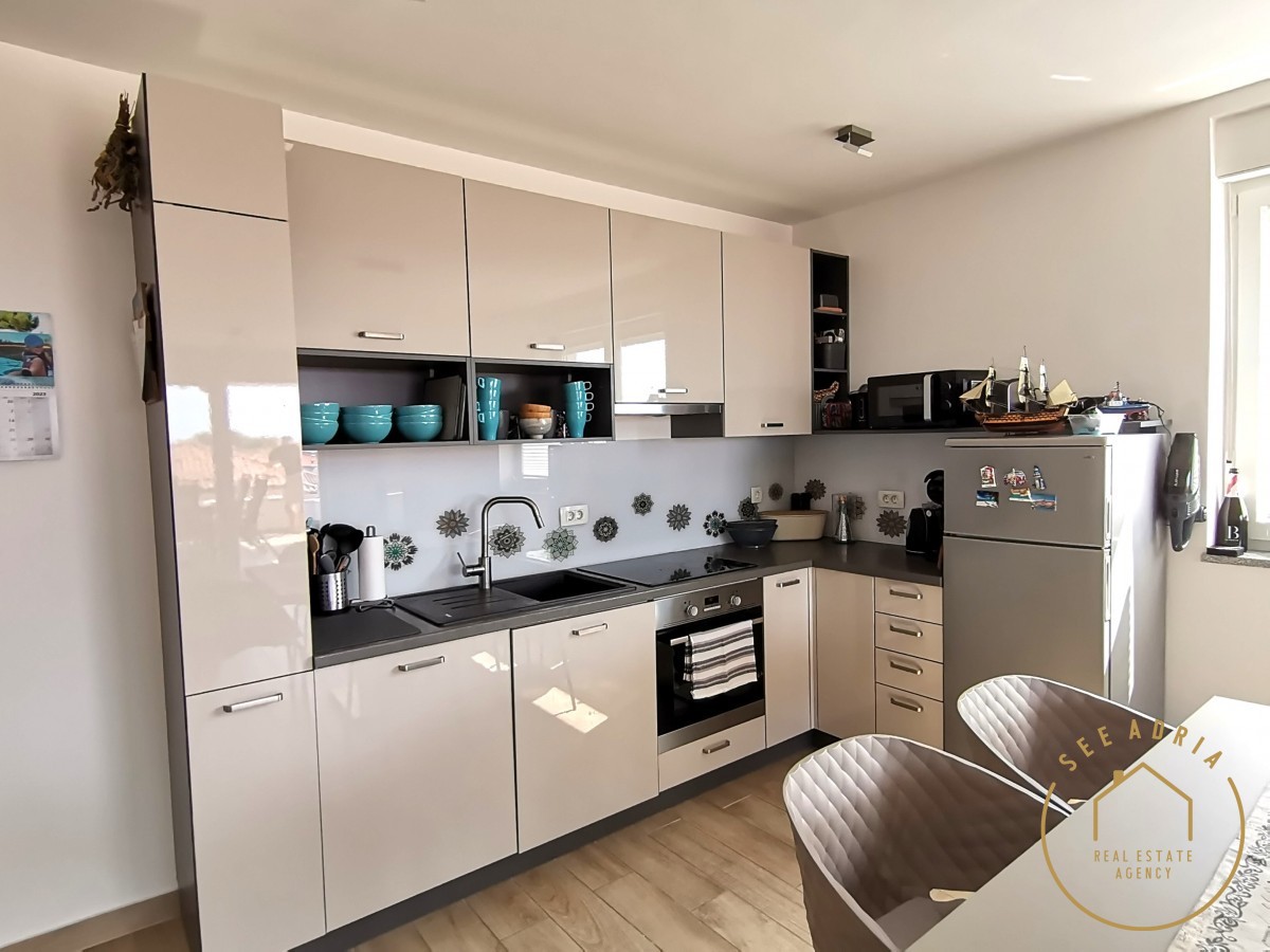 Stan na 1.katu zgrade sastoji se od 2 spavaće sobe, kupaonice, kuhinje sa blagovaonicom i dnevnim boravkom u "open space" izvedbi iz kojih se kroz staklenu stijenu izlazi na natkrivenu terasu sa koje se pruža lijepi pogled na more!