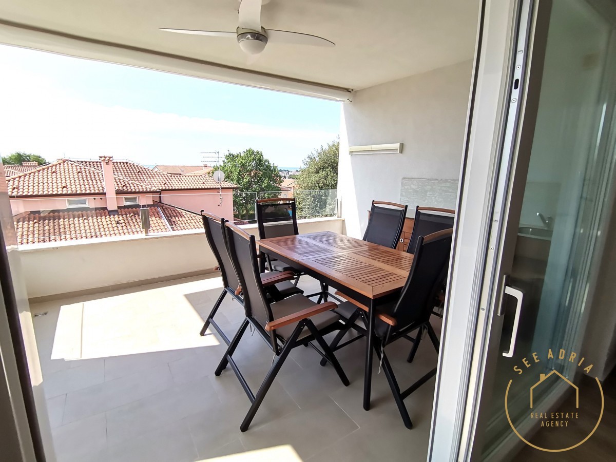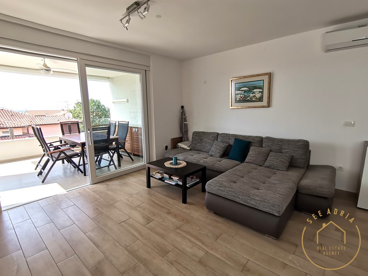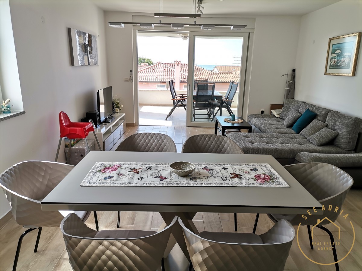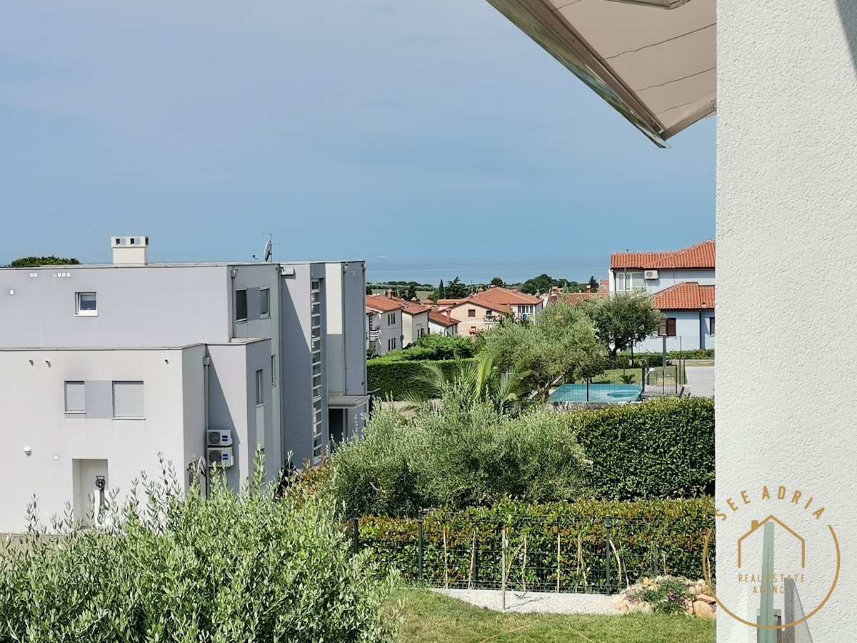 Stan na 1.katu zgrade sastoji se od 2 spavaće sobe, kupaonice, kuhinje sa blagovaonicom i dnevnim boravkom u "open space" izvedbi iz kojih se kroz staklenu stijenu izlazi na natkrivenu terasu sa koje se pruža lijepi pogled na more!